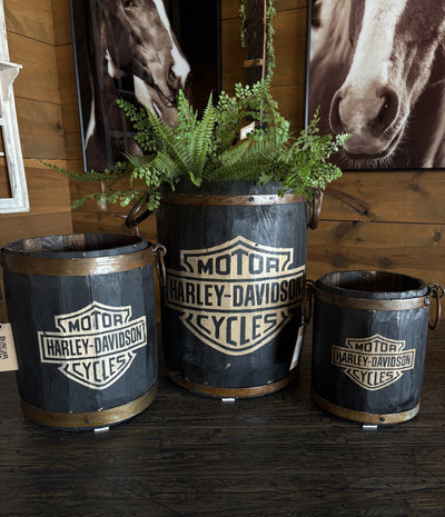 This barrel, featuring sturdy metal handles, serves as an ideal addition to any man cave or Harley Davidson enthusiast’s collection. For women, it offers a stylish platform to showcase your favorite plants, making your she shed stand out even more than the man cave.